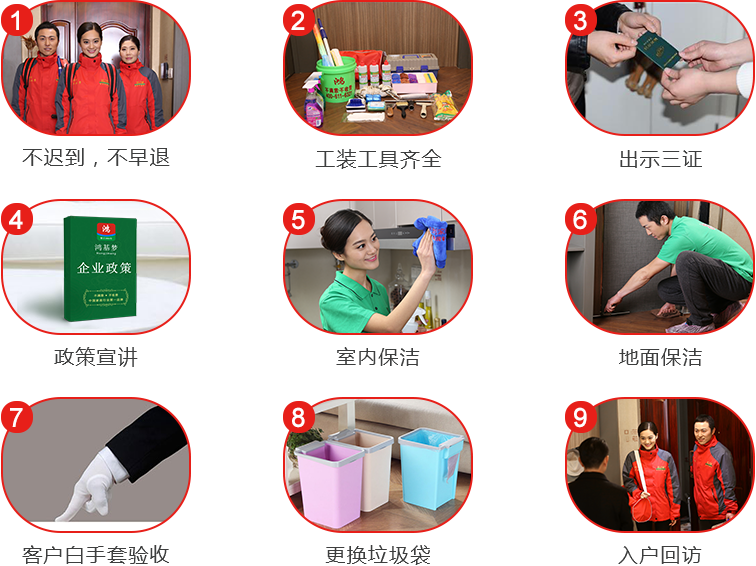 1.窗明幾凈:服務管理完成任務后屋子里衛生明媚 2.干干凈徹底凈:工作到位后無泥垢、塵灰、硫氰酸鹽 3.井然協調有序:物料放置平整,綜合打掃衛生清理